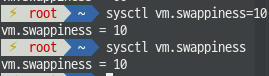 sysctl vm.swappiness=10 #원하는 설정값 입력, 예제에선 10